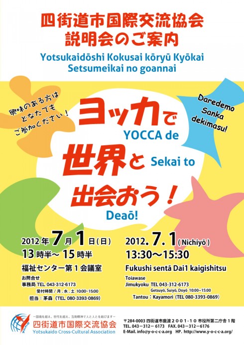 来たる7月1日、四街道市国際交流協会(ヨッカ)の説明会を開催します。
