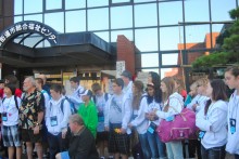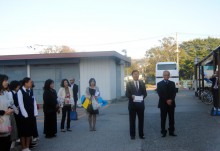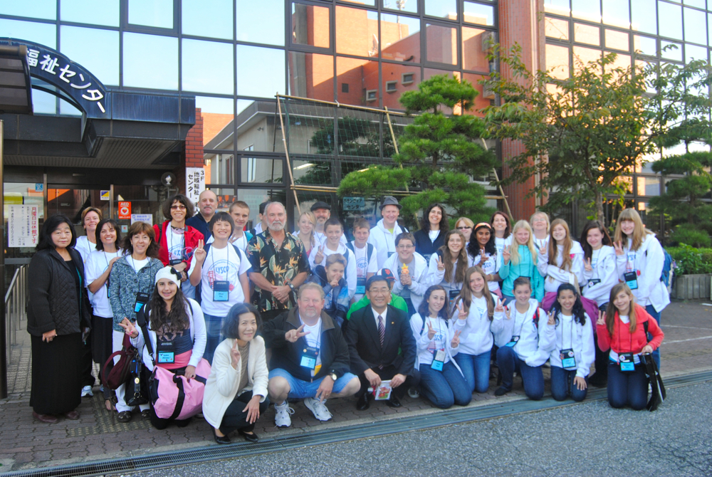 朝7時50分、市役所前集合。佐渡市長の挨拶後、リバモアご一行とホストファミリー全員で集合写真を撮りました。