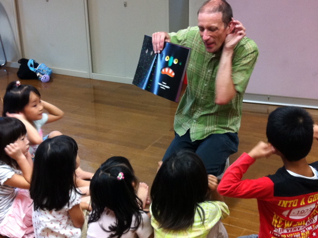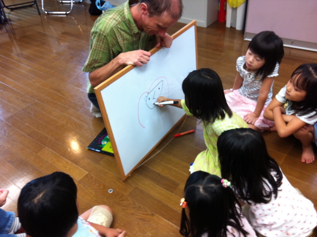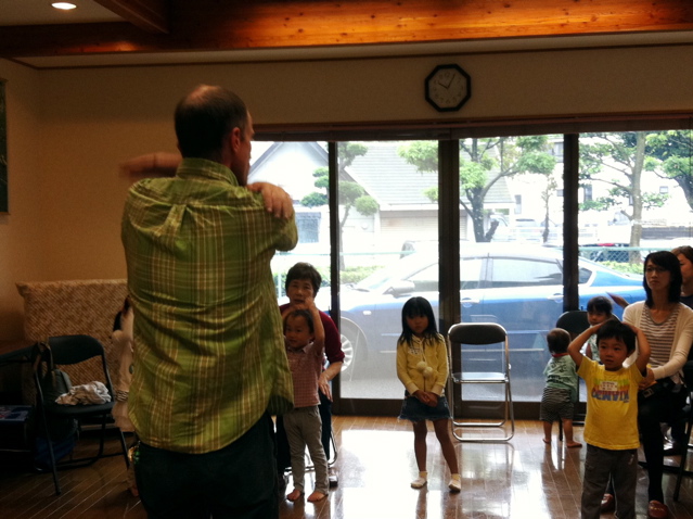 Little kidsですので、理屈よりもとにかく体で英語を覚えることが大事。そんなことは百も承知のデボン先生は、あいさつ代わりに♪Head, shoulders, knees and toes… に合わせて頭や肩、ひざ、つま先にタッチしてみせました。