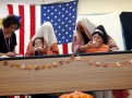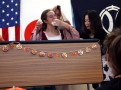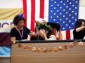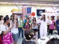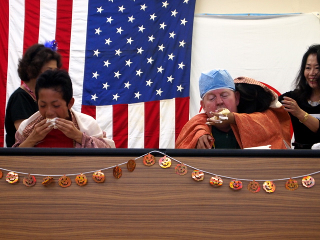 そして会の盛り上がりが絶頂に達したのが「二人羽織」!日米それぞれチームを組み、リレー形式で次々とケーキを”2人で”食べていきます。クリームまみれになる子どもたち、会場を爆笑の渦にたたき込みました。