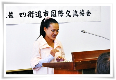 「四街道国際交流友の会」時代の日本語学習者。「”微笑みの国”と呼ばれるタイから来た私は、同じく微笑みの国から来た人に助けられた。日本語が話せる人だったので、とても心強く感じた。その人のおかげで私も日本語が話せるようになったし、買い物も一人でできるまでになりました。今はスーパーでの仕事を頑張っています」